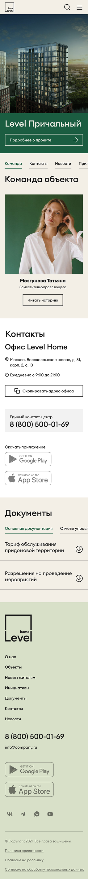 Содержит информацию, ориентированную в первую очередь на действующих клиентов - жильцов домов, находящихся под управлением компании. В каждой карточке объекта на одной странице демонстрируется вся самая важная и необходимая информация: описание дома, контакты офиса, команда и документация объекта.