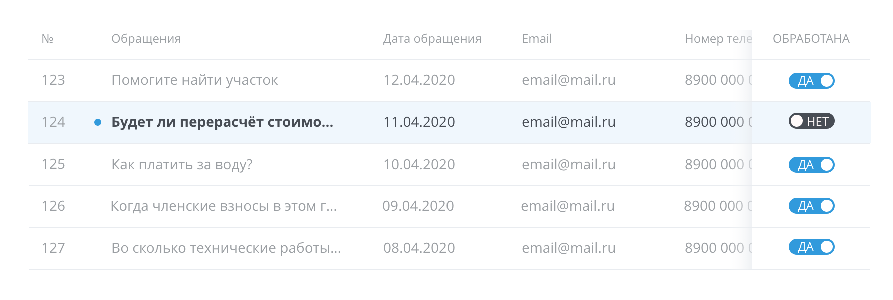 Обеспечили эффективную коммуникацию председателя с участниками СНТ — все обращения регистрируются и отображаются в одной таблице с возможностью их интерактивной обработки.